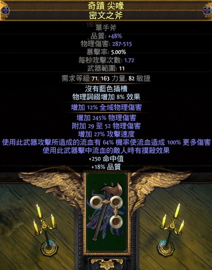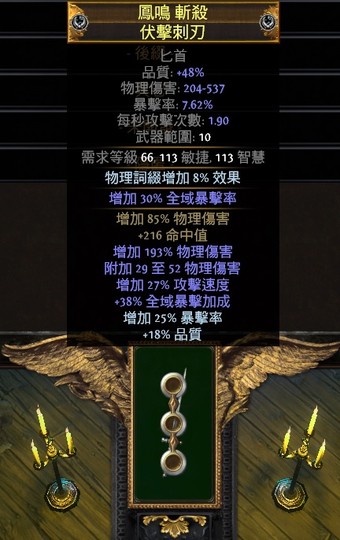 增加52%物理傷害 / 擊中流血敵人撲殺效果(T1頂數值詞綴)