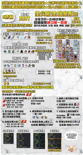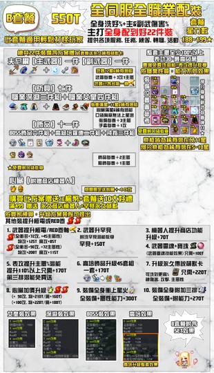 例如:伺服器:艾麗亞 職業:凱內西斯,限量款套餐,升級1.V武器+2.傳說武器+3.130魔心臟+6.升級4S頂培