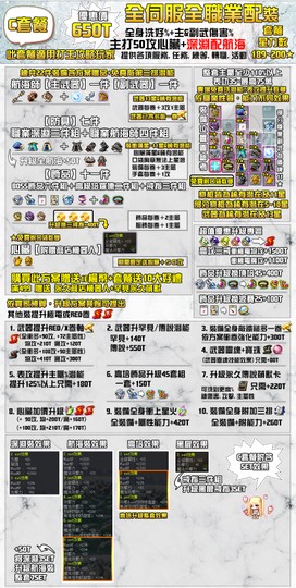 例如:伺服器:艾麗亞 職業:凱內西斯,限量款套餐,升級1.V武器+2.傳說武器+3.130魔心臟+6.升級4S頂培