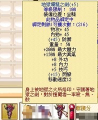 地獄燭龍之劍 100 體力+2000、真氣+1500、外功+8、技巧+5、內力+8、物攻+45、內勁+45