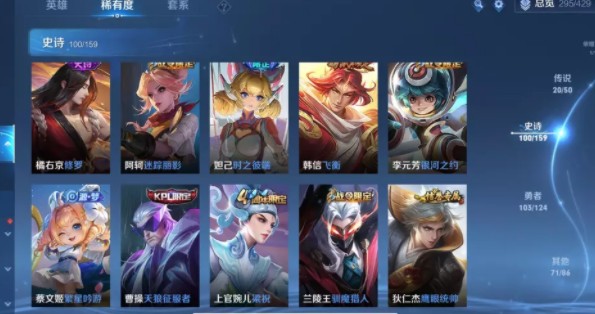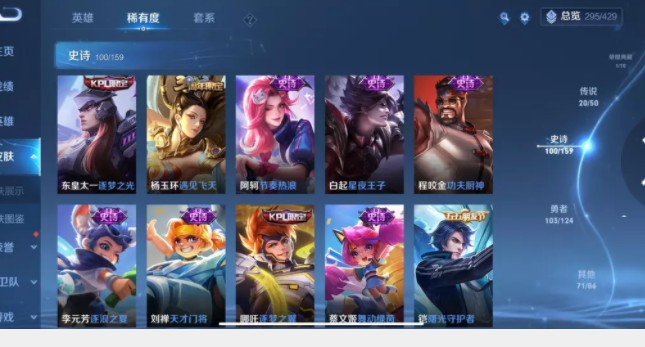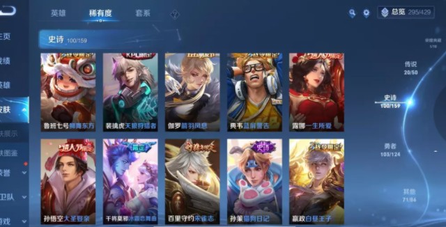 史詩皮膚:百裏守約-朱雀誌,曹操-天狼征服者,妲己-時之彼端,貂蟬-逐夢之音,伽羅-天狼溯光者,幹將莫邪-冰霜戀舞曲,關羽-冰鋒戰神,韓信-逐夢之影,韓信-飛衡,韓信-傲雪梅槍,花木蘭-青春決賽季,鏡-匿光追影者,廉頗-寅虎·禦盾,馬超-神威,馬可波羅-逐夢之星,裴擒虎-天狼狩獵者,上官婉兒-天狼繪夢者,司馬懿-暗淵魔法,孫悟空-至尊寶,孫悟空-大聖娶親,孫悟空-孫行者,楊玉環-寅虎·心曲,趙雲-引擎之心