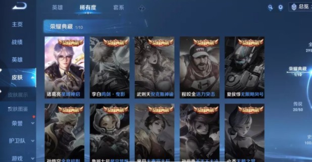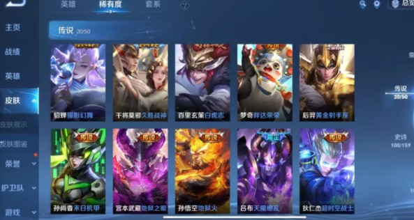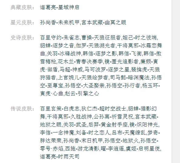 傳說皮膚:百裏玄策-白虎誌,狄仁傑-超時空戰士,貂蟬-貓影幻舞,幹將莫邪-久勝戰神,公孫離-祈雪靈祝,宮本武藏-地獄之眼,關羽-武聖,後羿-黃金射手座,鏡-熾陽神光,李信-一念神魔,劉備-時之戀人,呂布-天魔繚亂,夢奇-胖達榮榮,孫尚香-末日機甲,孫悟空-地獄火,孫悟空-零號·赤焰,西施-遊龍清影,曜-李逍遙,虞姬-啟明星使,諸葛亮-時雨天司