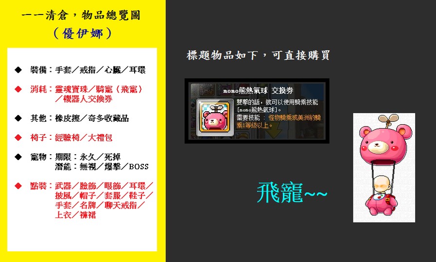 主單連結:(道具/點裝/戰鬥機器人/騎寵/椅子/圖騰/寵物.....會優先更新)