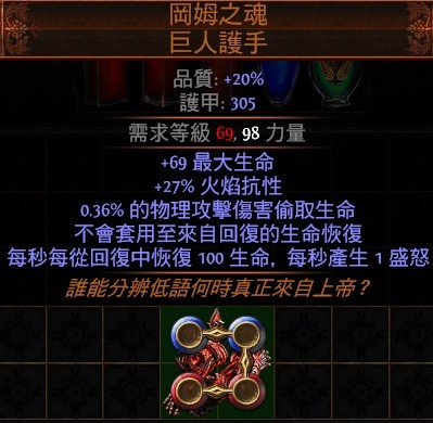 PoE👌傳奇→岡姆之魂.巨人護手 (最大生命、火焰抗性、盛怒、物理傷害偷生命)