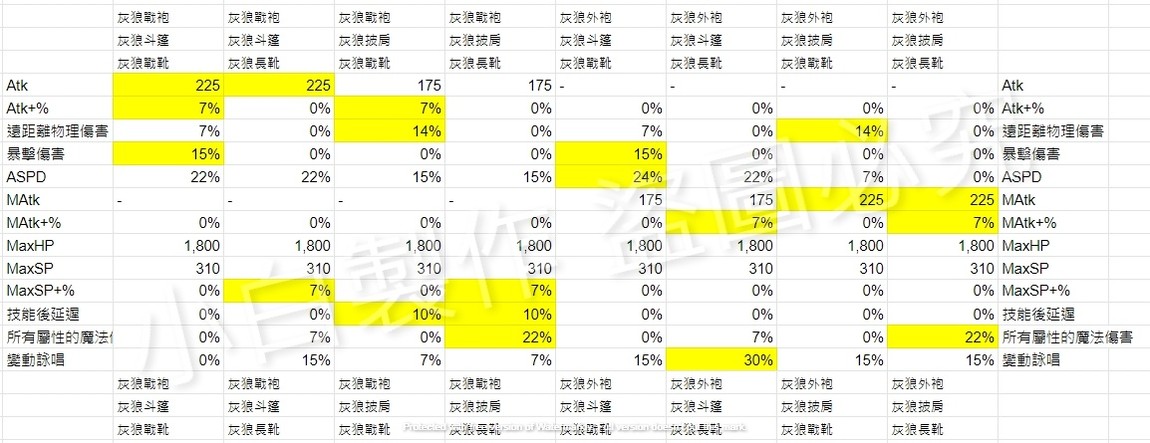 套裝比較表以+7為基準,資料僅供參考,請以遊戲內為主