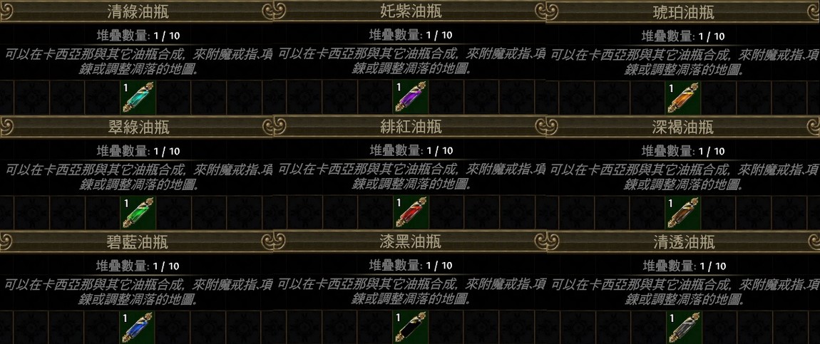 PoE汙染映像👌金黃純銀乳白漆黑緋紅油瓶催化洶湧研磨冶鍊本質充能富饒多稜催化劑