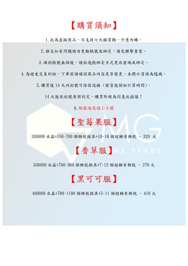 1.移交帳號有問題時請勿動號及綁定,請先諮詢賣家。 2.此為虚擬商品,不支持七天鑑賞期,如介意請勿購買。 3.交易時確認帳號資源無誤後,切記依照遊戲綁定方式更改密碼以及綁定。 4.下單前先與客服確認商品是否有更動,為避免交易糾紛,務必確認賣場商品再下標。 帳號內容物已清楚打出來,未標示資源皆為隨機附送於帳號內。 5.購買帳號14天內發生封號情況保固包退換!(發貨後開始計算時間), 若14天後若發生封號狀況依封號理由判斷,下單商品後,說明您已經閱讀該協議! 6.帳號皆僅過1-3關 自選號網址: ppt.cc/fbED9x