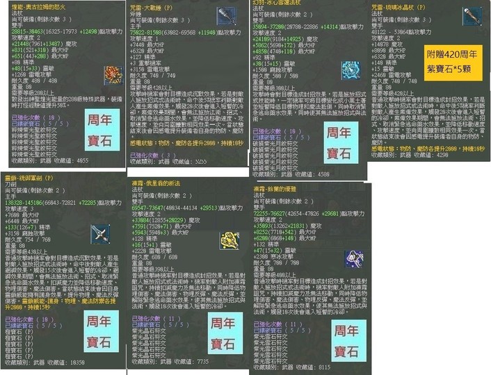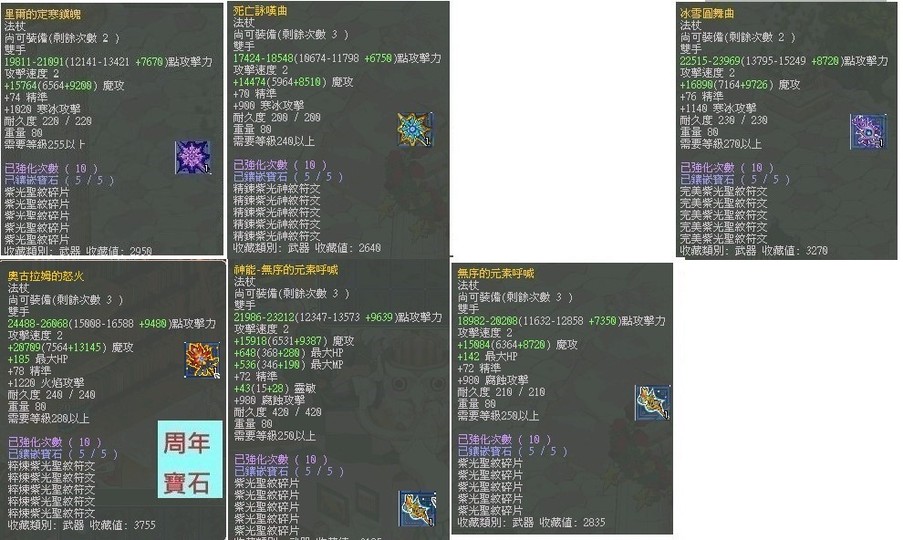| 390周年凍霜杖 | 魔攻35616 | 13W 5D(周年紫寶)1S 融滿 | 4000T |