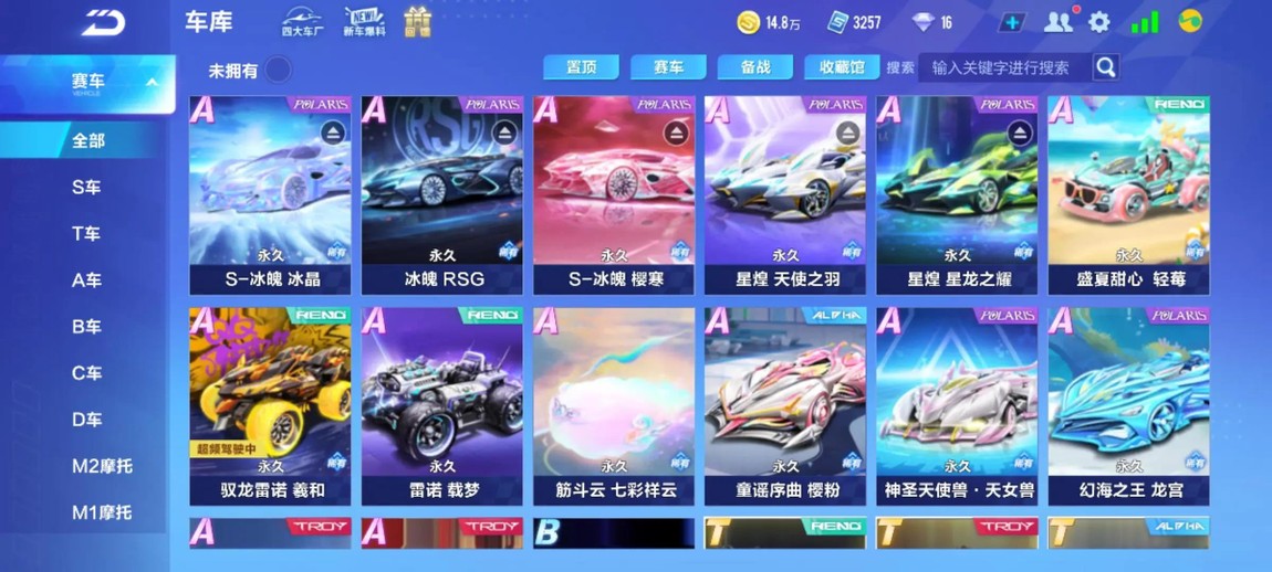 車庫:噬天饕餮 俠影傳說 圣光使者 超能橘喵 柯星出擊 風暴剃刀 動感熊貓 極音戰歌 白玉神駒 凌霜風暴 藍影主宰 光電游俠 雷諾 凌天 裂空 狂獅 赤炎天啟 紫焰鎧甲