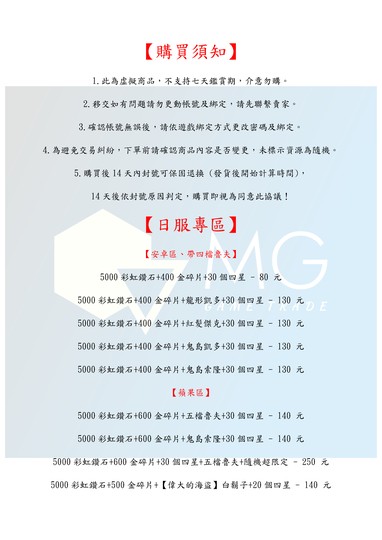 1.此為虚擬商品,不支持七天鑑賞期,介意勿購。 2.移交如有問題請勿更動帳號及綁定,請先聯繫賣家。 3.確認帳號無誤後,請依遊戲綁定方式更改密碼及綁定。 4.為避免交易糾紛,下單前請確認商品內容是否變更,未標示資源為隨機。 5.購買後14天內封號可保固退換 (發貨後開始計算時間), 14天後依封號原因判定,購買即視為同意此協議!