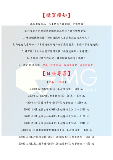 1.此為虚擬商品,不支持七天鑑賞期,介意勿購。 2.移交如有問題請勿更動帳號及綁定,請先聯繫賣家。 3.確認帳號無誤後,請依遊戲綁定方式更改密碼及綁定。 4.為避免交易糾紛,下單前請確認商品內容是否變更,未標示資源為隨機。 5.購買後14天內封號可保固退換 (發貨後開始計算時間), 14天後依封號原因判定,購買即視為同意此協議! 6. 绑定BNID帳號;安卓IOS不互通,石頭會清空,本店不負責。