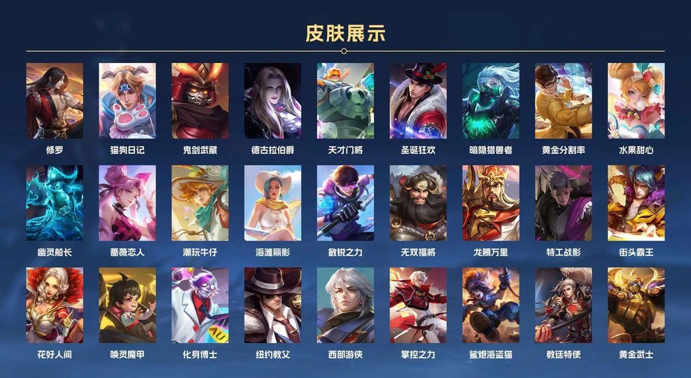 史詩皮膚:孫策-貓狗日記 百里玄策-原初追逐者 云中君-纖云弄巧 孫尚香-水果甜心 諸葛亮-黃金分割率 橘右京-修羅 劉禪-天才門將 劉邦-德古拉伯爵 宮本武藏-鬼劍武藏 花木蘭-水晶獵龍者 程咬金-功夫廚神 曹操-幽靈船長 呂布-圣誕狂歡 不知火舞-魅語 蘭陵王-暗隱獵獸者 孫悟空-大圣娶親 鬼谷子-五谷豐年 莊周-高山流水 甄姬-游園驚夢 裴擒虎-李小龍