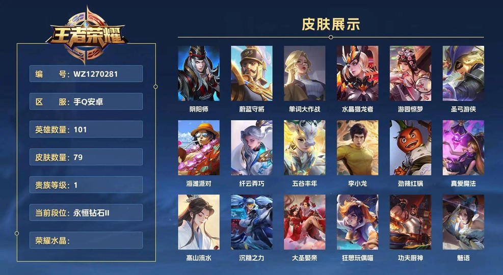 描述:WZ1270281手Q安卓 101英雄 79皮膚 貴族等級1 陰陽師 蔚藍守將 單詞大作戰 水晶獵龍者 游園驚夢 圣弓游俠 海灘派對 纖云弄巧 五谷豐年 李小龍 勁辣紅鍋 真愛魔法 高山流水 沉穩之力 大圣娶親 狂想玩偶喵 功夫廚神 魅語 修羅 貓狗日記 鬼劍武藏 德古拉伯爵 天才門將 圣誕狂歡 暗隱獵獸者 黃金分割率 水果甜心 幽靈船長 薔薇戀人 潮玩牛仔 海灘麗影 敏銳之力 無雙福將 龍騰萬