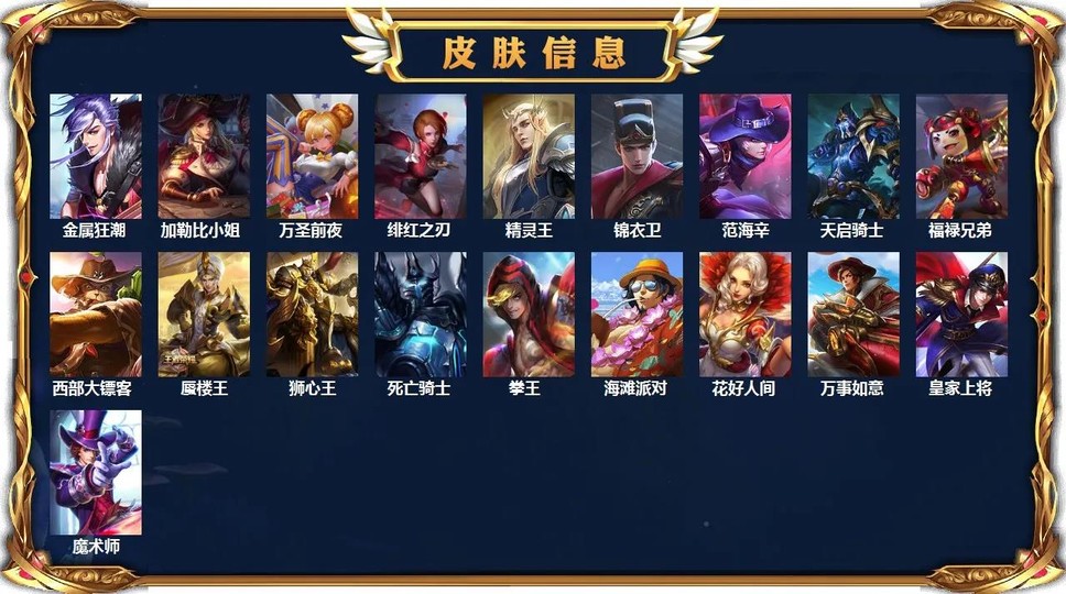 其他皮膚:百里守約-絕影神槍 百里玄策-威尼斯狂歡 曹操-死神來了 大喬-伊勢巫女 狄仁杰-錦衣衛 貂蟬-異域舞娘 高漸離-金屬狂潮 關羽-天啟騎士 后羿-精靈王 黃忠-芝加哥教父 鎧-龍域領主 李白-范海辛 劉邦-圣殿之光 劉禪-英喵野望 露娜-緋紅之刃 魯班七號-福祿兄弟 馬可波羅-激情綠茵 上官婉兒-修竹墨客 孫悟空-西部大鏢客 王昭君-精靈公主 夏侯惇-戰爭騎士 小喬-萬圣前夜 雅典娜-戰爭女神 虞姬-加勒比小姐 張良-一千零一夜 鐘馗-地府判官 鐘無艷-生化警戒 周瑜-海軍大將 諸葛亮-星航指揮官