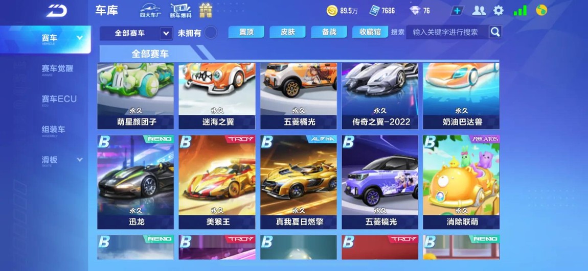 車庫:瘋狂二哈 火線追擊 帝王 月光女神 動感熊貓 白玉神駒 海神 凌霜風暴 極地戰甲