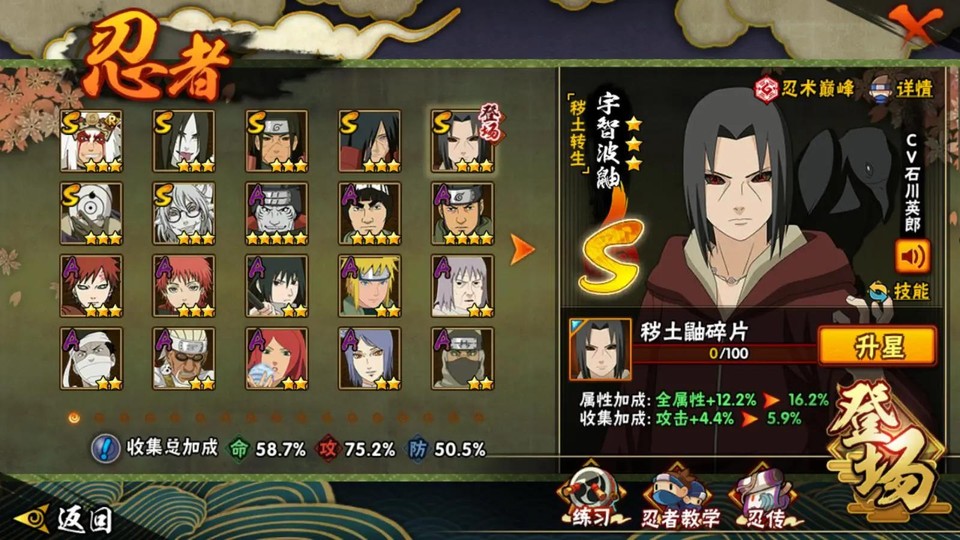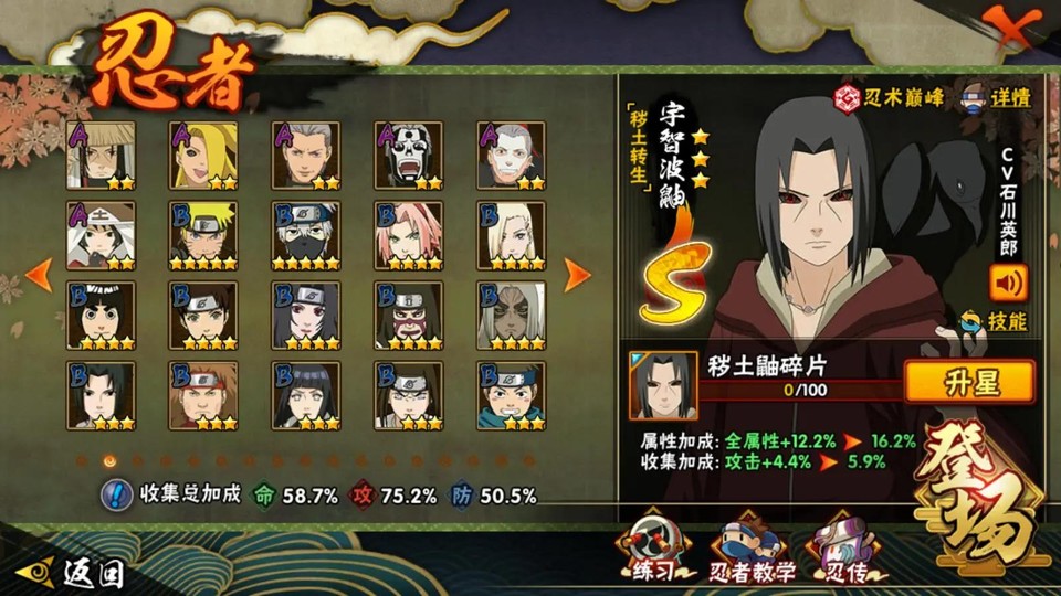 S忍:宇智波斑·白面具 宇智波斑·穢土轉生 蜀面豪杰·自來也 大蛇丸 宇智波鼬·穢土轉生 藥師兜·仙人模式 千手柱間·穢土轉生