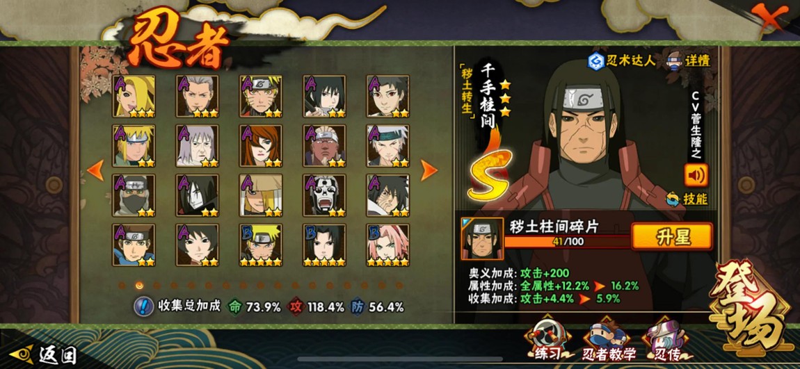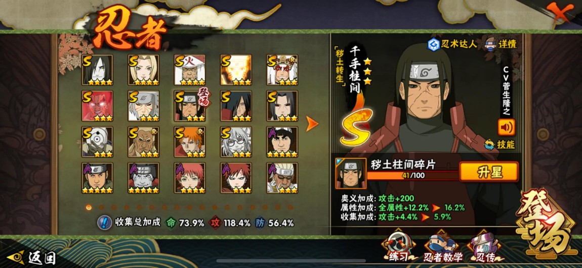 S忍:死門·邁特凱 佩恩天道·超 九喇嘛連結·漩渦鳴人 宇智波斑·穢土轉生 宇智波鼬·穢土轉生 宇智波斑·白面具 千手柱間·穢土轉生 藥師兜·仙人模式 大蛇丸 蜀面豪杰·自來也 綱手 猿飛日斬·穢土轉生 千手扉間·穢土轉生 艾·四代目雷影