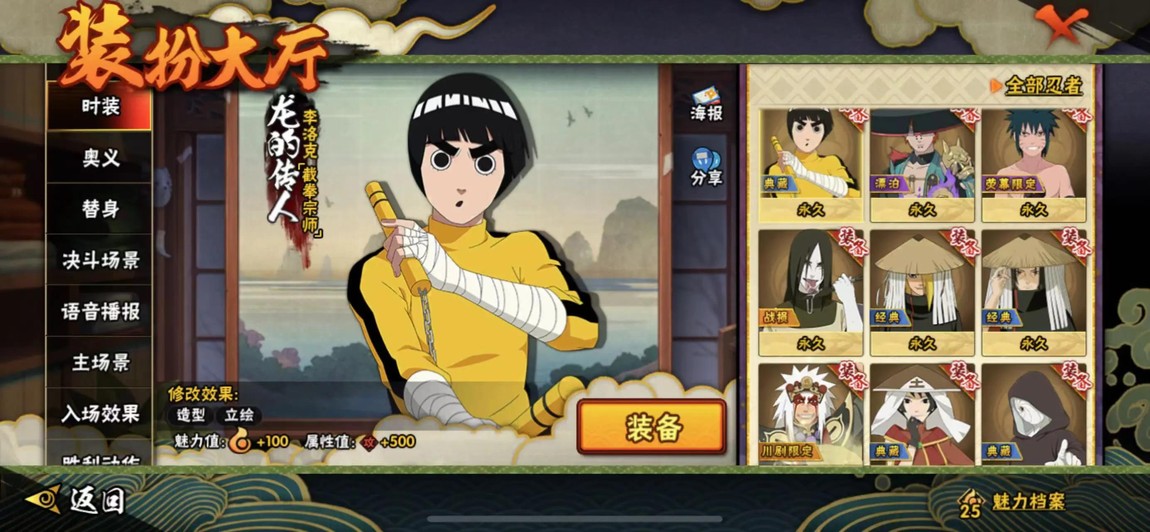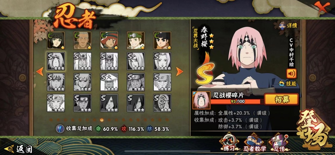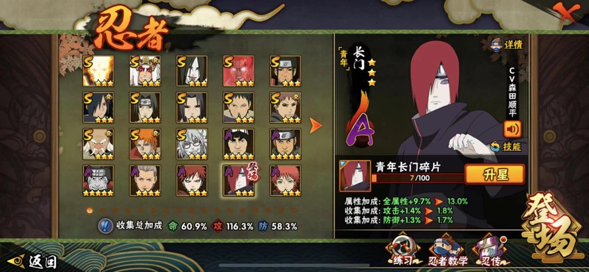 S忍:藥師兜·仙人模式 死門·邁特凱 蜀面豪杰·自來也 九喇嘛連結·漩渦鳴人 佩恩天道·超 宇智波斑·木葉創立 宇智波鼬·須佐能乎 宇智波鼬·穢土轉生 自來也·舞之豪杰 千手柱間·穢土轉生 羅砂·四代目風影 大野木·忍界大戰 宇智波帶土·忍者大戰