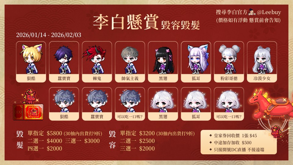 毀容主打單指定3200 2選1 2500 3選1 2000