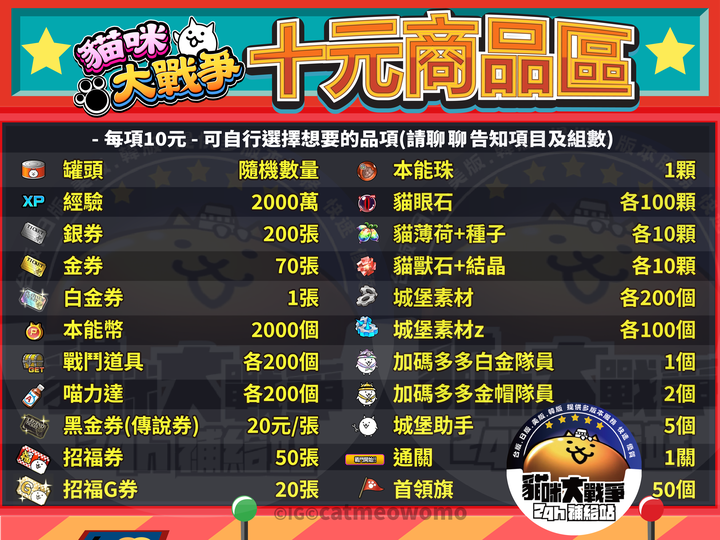 喵力達 各200個 | 加碼多多金帽隊員 2個 | |