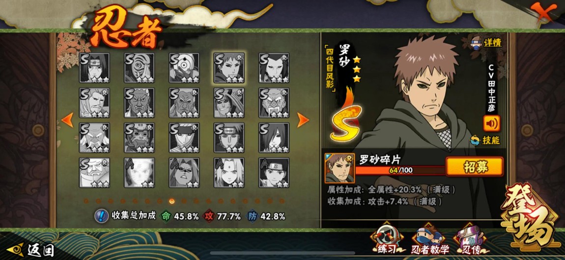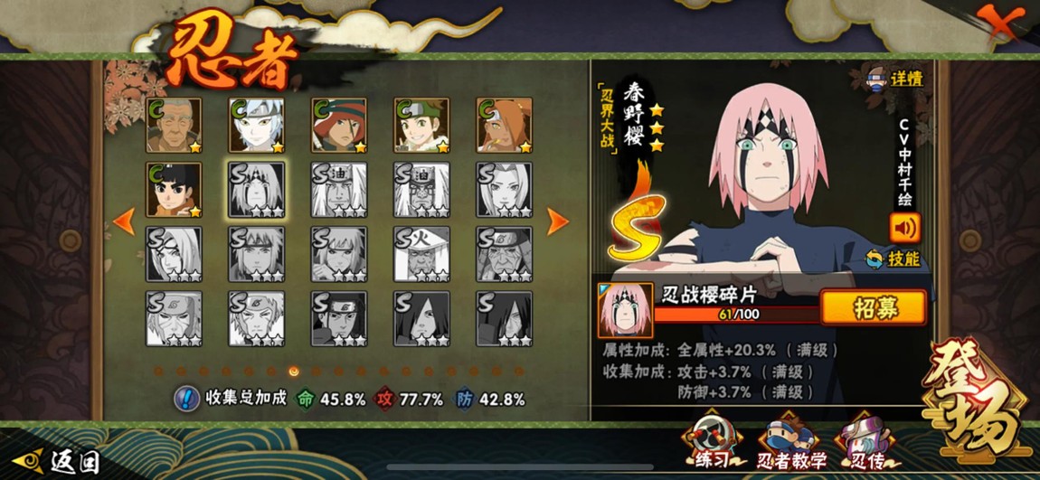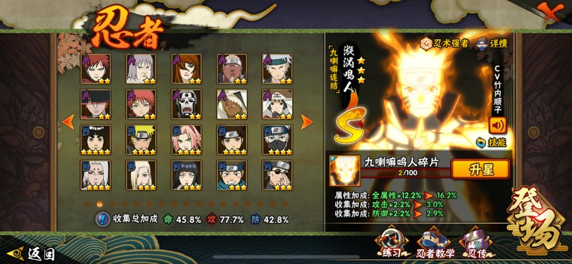 S忍:藥師兜·仙人模式 死門·邁特凱 蜀面豪杰·自來也 佩恩天道·超 九喇嘛連結·漩渦鳴人 宇智波斑·木葉創立 宇智波鼬·穢土轉生 宇智波帶土·忍者大戰 千手柱間·穢土轉生 大蛇丸