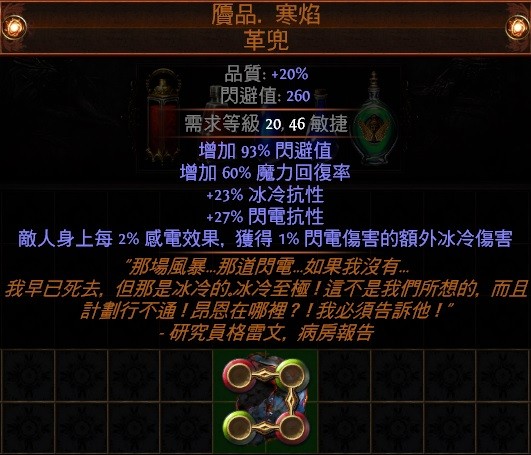 PoE👌傳奇→贗品.寒焰 革兜 (2%感電效果獲得額外1%閃電傷害的冰冷傷害)