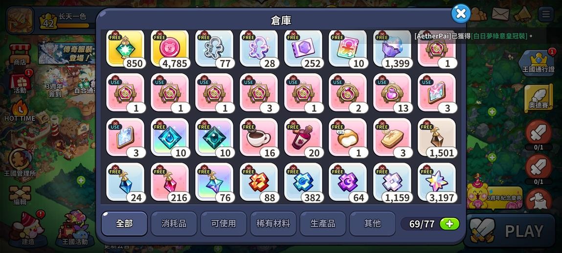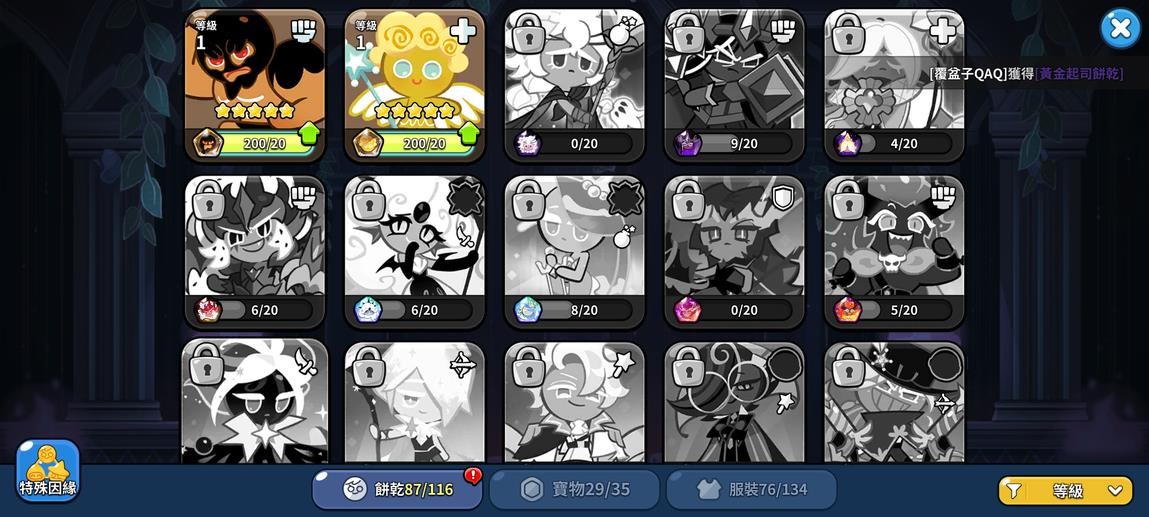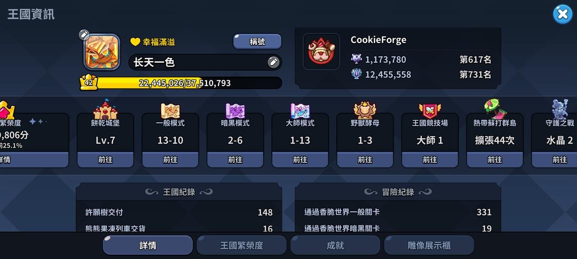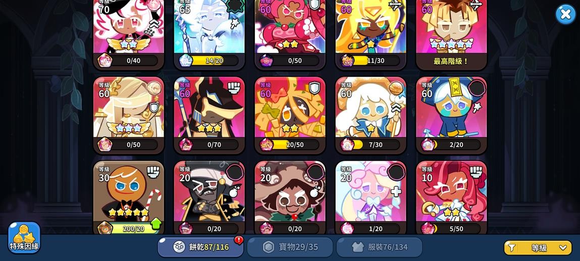 薑餅人王國 國際服,不想玩了,出了回本。聖黴果伺服器。 滿星焦糖布丁,一星黃金起司,版本強力餅乾都在,競技場很好打,體力一萬多,不愁不夠用。 工會排名很高,鑽石抽卡很多,推圖還能有十來萬,生產格子都是滿級,一鍵生產解放雙手。 地標等級高都在,價格實惠,適合遊玩,詳細資源如圖。