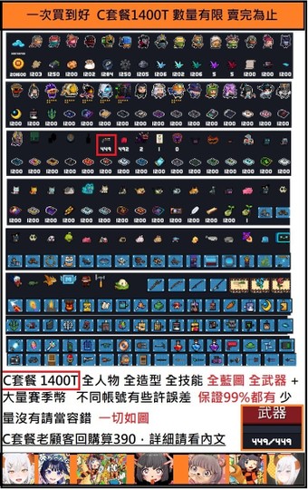 (已賣完)💭※C套餐 1400T 【全人物 全造型 全技能 全圖紙 全武器 藍鑽 賽季幣 小魚乾 】老顧客回購算390 數量有限 賣完為止