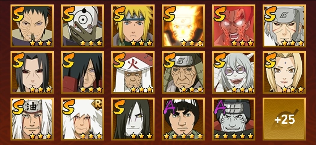 飛段,舞之豪傑自來也,穢土扉間,仙人兜,阿斯瑪,鬼鮫,須佐佐助,蠍,三代火影,斗篷兜,忍戰奇拉比,青年長門,綱手,忍戰我愛羅,穢土斑,迪達拉,死司飛段,白面具,青年艾,穢土日斬,五代水影,穢土迪達拉,團藏,死門凱,曉大蛇丸,大蛇丸,奇拉比,忍戰帶土,鼬,萬花筒佐助,忍戰丁次,青年水門,凱,自來也,九喇嘛鳴人,博人傳黑土,水門,角都,博人傳達魯伊,疾風傳我愛羅,穢土鼬,近松十人衛千代