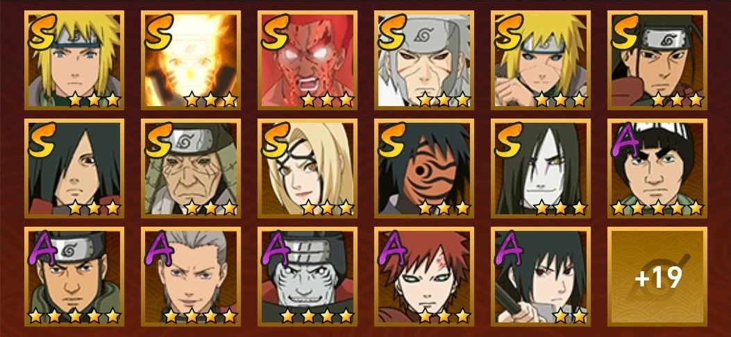 飛段,穢土扉間,百豪櫻,阿斯瑪,鬼鮫,須佐佐助,蠍,斗篷兜,博人傳木葉丸,斑,青年長門,紅夜帶土,忍戰我愛羅,死司飛段,青年艾,穢土日斬,五代水影,死門凱,曉大蛇丸,大蛇丸,奇拉比,六代水影,鼬,萬花筒佐助,忍戰丁次,柱間,凱,地怨虞角都,九尾鳴人,九喇嘛鳴人,水門,博人傳達魯伊,疾風傳我愛羅,穢土水門,百豪綱手,近松十人衛千代