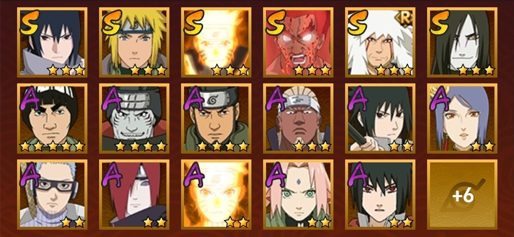 飛段,舞之豪傑自來也,大蛇丸,死門凱,六代水影,阿斯瑪,百豪櫻,鬼鮫,萬花筒佐助,鼬,須佐佐助,蠍,凱,九尾鳴人,永恆萬花筒佐助,青年長門,九喇嘛鳴人,水門,新春小南,迪達拉,疾風傳我愛羅,死司飛段,青年艾
