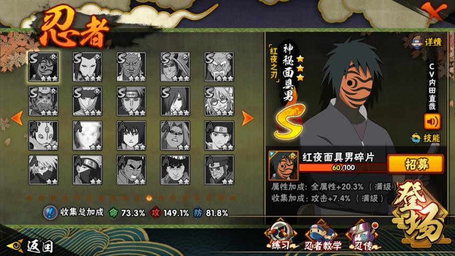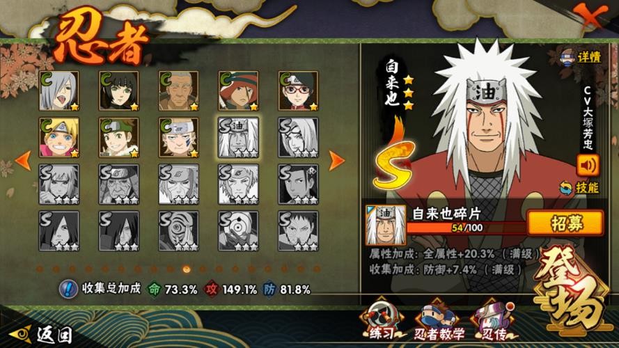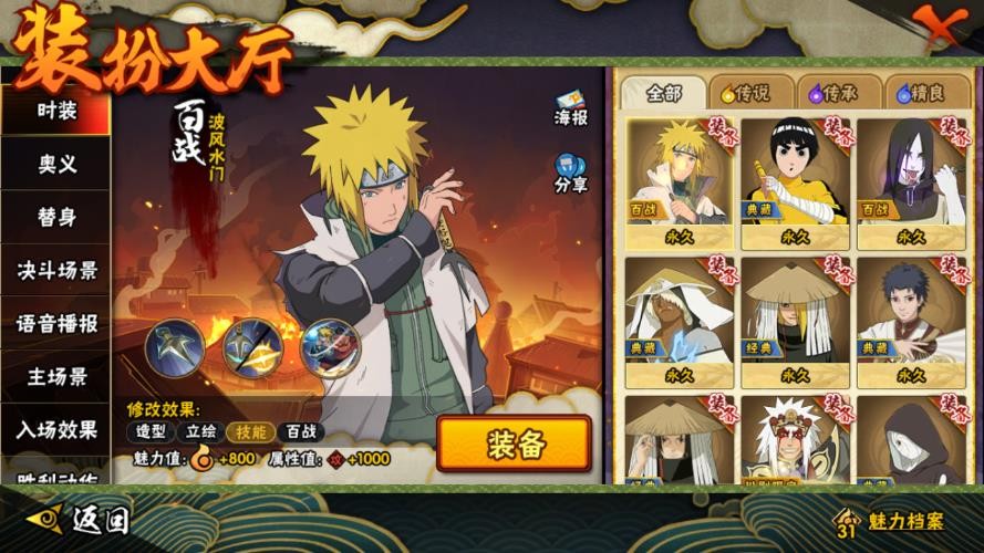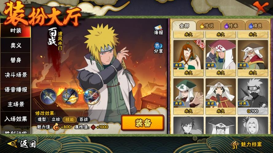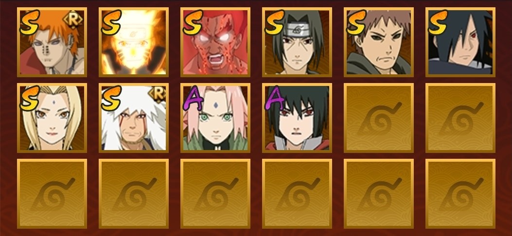 須佐鼬,創立斑,綱手,舞之豪傑自來也,九喇嘛鳴人,死門凱,百豪櫻,天道超,萬花筒佐助,四代風影