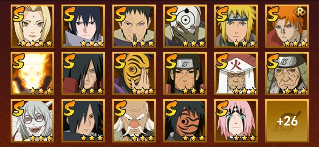 新春止水,創立斑,飛段,舞之豪傑自來也,仙人兜,阿斯瑪,鬼鮫,金式,須佐佐助,蠍,三代火影,忍戰大野木,青年長門,永恆萬花筒佐助,忍戰櫻,漂泊六道,綱手,紅夜帶土,迪達拉,穢土斑,天道超,新春鼬,死司飛段,白面具,青年艾,穢土日斬,穢土迪達拉,神秘面具男,大蛇丸,奇拉比,六代水影,鼬,忍戰帶土,忍戰丁次,穢土柱間,青年水門,凱,暴怒帶土,九喇嘛鳴人,水門,角都,疾風傳我愛羅,近松十人衛千代