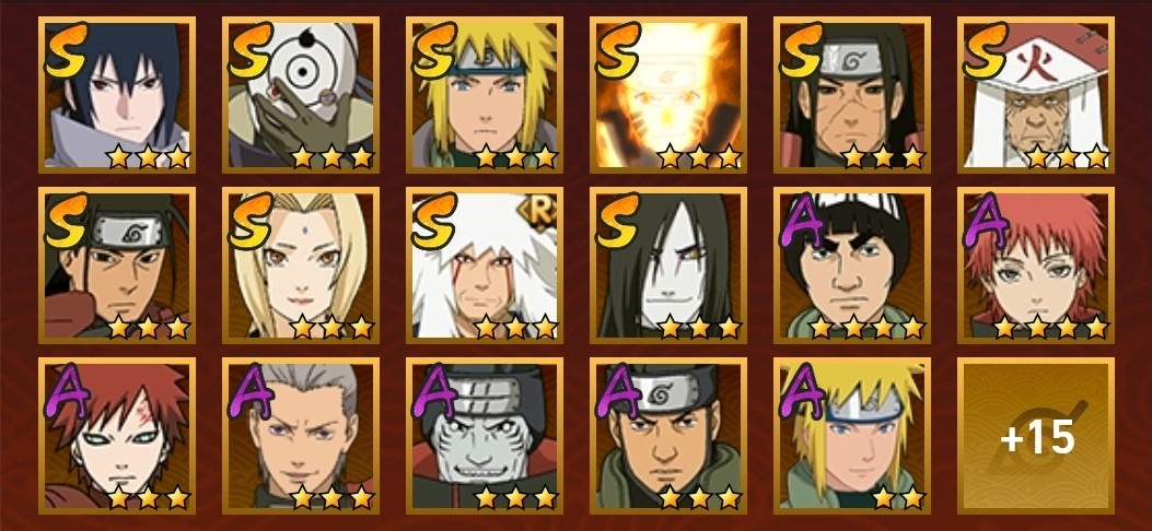 飛段,舞之豪傑自來也,阿斯瑪,鬼鮫,蠍,三代火影,斗篷兜,博人傳木葉丸,忍戰奇拉比,永恆萬花筒佐助,青年長門,綱手,迪達拉,白面具,死司飛段,止水,青年艾,萬花筒卡卡西,大蛇丸,六代水影,仙人鳴人,鼬,穢土柱間,穢土阿斯瑪,忍戰丁次,柱間,凱,青年水門,九喇嘛鳴人,水門,疾風傳我愛羅,近松十人衛千代
