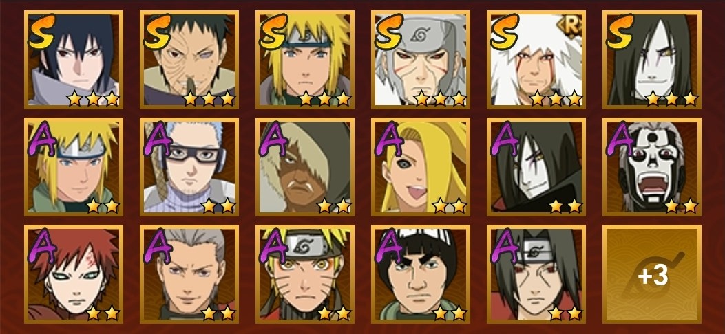 穢土迪達拉,飛段,舞之豪傑自來也,大蛇丸,曉大蛇丸,穢土扉間,仙人鳴人,六代水影,阿斯瑪,忍戰帶土,鼬,鬼鮫,蠍,青年水門,凱,永恆萬花筒佐助,水門,博人傳達魯伊,疾風傳我愛羅,死司飛段