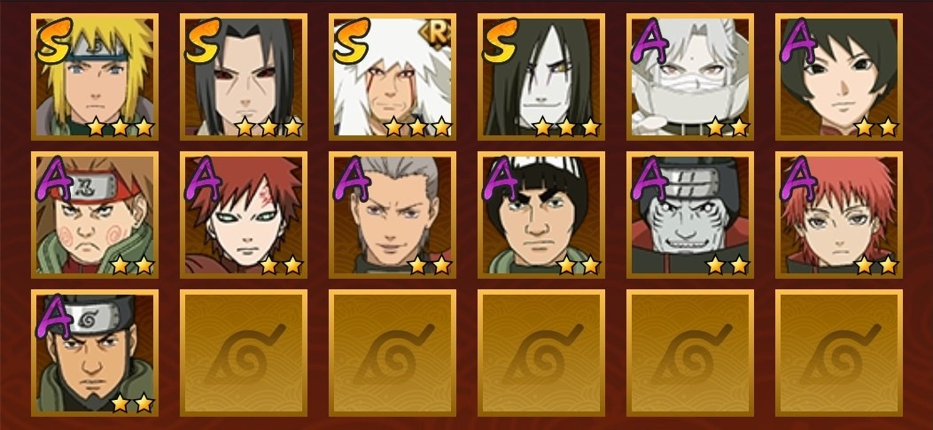 飛段,舞之豪傑自來也,大蛇丸,阿斯瑪,鬼鮫,忍戰丁次,蠍,凱,卑留呼,博人傳黑土,水門,疾風傳我愛羅,穢土鼬