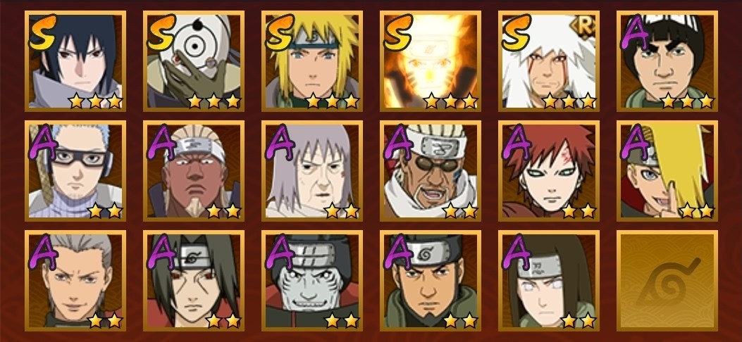 忍戰寧次,飛段,舞之豪傑自來也,奇拉比,六代水影,阿斯瑪,鼬,鬼鮫,凱,永恆萬花筒佐助,九喇嘛鳴人,水門,迪達拉,疾風傳我愛羅,白面具,近松十人衛千代,青年艾