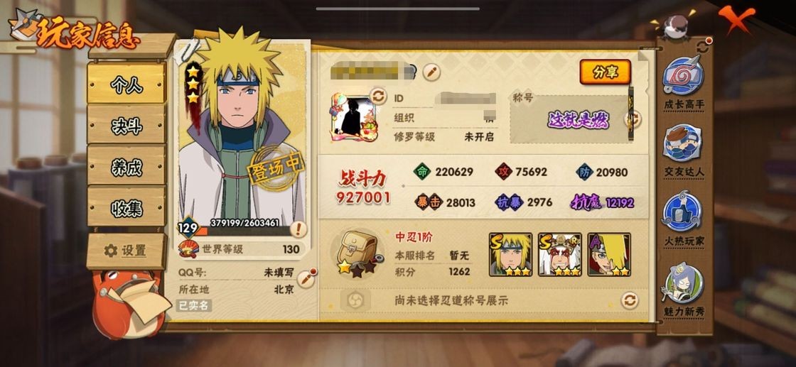 【2S忍者 1A忍者】【安卓Q-2632區-129級-V1-92萬戰力】【S級】豪傑自來也 波風水門【A級】迪達拉
