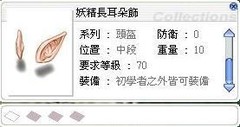 妖精長耳朵飾1洞 系列-頭盔 防禦0 位置-頭中 重量10 要求等級70 裝備-初學者之外都可以裝備