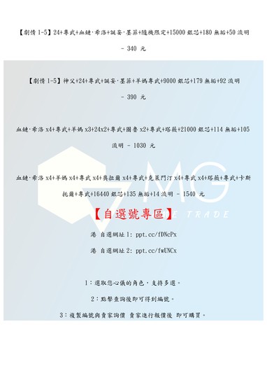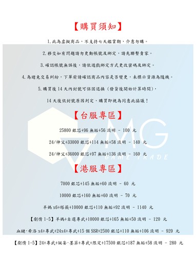 1.此為虚擬商品,不支持七天鑑賞期,介意勿購。 2.移交如有問題請勿更動帳號及綁定,請先聯繫賣家。 3.確認帳號無誤後,請依遊戲綁定方式更改密碼及綁定。 4.為避免交易糾紛,下單前請確認商品內容是否變更,未標示資源為隨機。 5.購買後14天內封號可保固退換 (發貨後開始計算時間), 14天後依封號原因判定,購買即視為同意此協議!
