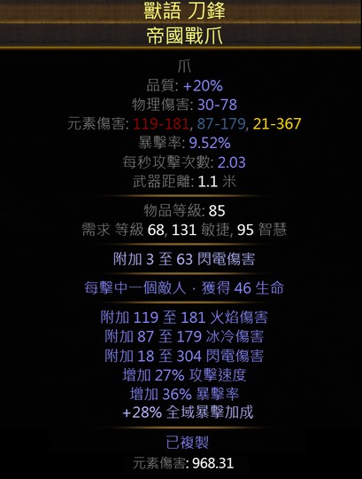 複製元素爪 DPS968 攻速暴率暴擊加成