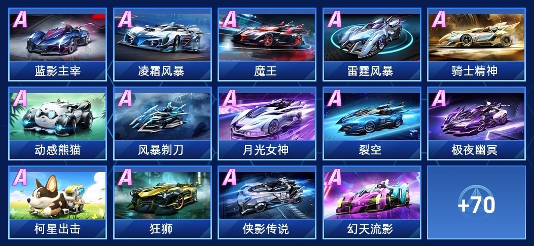 南瓜車,愛神之吻,月光女神,愛神之心,藍影主宰,凌霜風暴,魔王,騎士精神,1週年剃刀,雷霆風暴,動感熊貓,風暴剃刀,白馬王子,裂空,狂獅,狂歡電音,柯星出擊,2週年燃魂,2週年鋒芒,極鼠先鋒,暗芒,探索者-X,聖光之翼,極夜幽冥,武魂,黔靈,俠影傳說,凌雲蛋機,黔力,鱷霸,3週年光輝,暗蛟,雷諾,光之風暴,探影,幻天流影,凌天,蠻騎,3週年無畏,弒影,赤火流星,弒鋒,夜影星爵,玩家國度,天馬幻想,紫焰鎧甲,天馬流星,鱷寶,金剛鎧影,蔚藍迷夢,金剛鎧騎,逐夢號,赤焰天啟,川麻高手,真我戰神GT,S-冰魄,狸夢幻想,築夢狸想,冥霄,浪味仙蹤,神影,布偶虎,伊修扎克-蘭德爾,藍翔挖掘機,白桃戀人,春戀花車,萌菜出擊,卡羅拉 銳放,星河戰刃,航天逐夢,消除聯萌,五菱鏡光,蜜戀之風,瀚宇騎士,穹音星鯨,美猴王,小鵬P7·雲岫,幻夜霓虹,全新十速,夜王,霹靂針尖,幻光魅影,墨染青花,S-月影