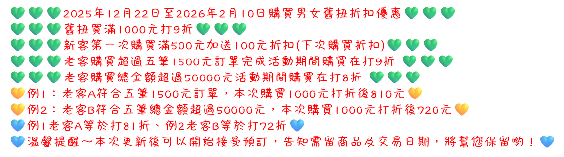 💚💚💚2025年12月22日至2026年2月10日購買男女舊扭折扣優惠💚💚💚
