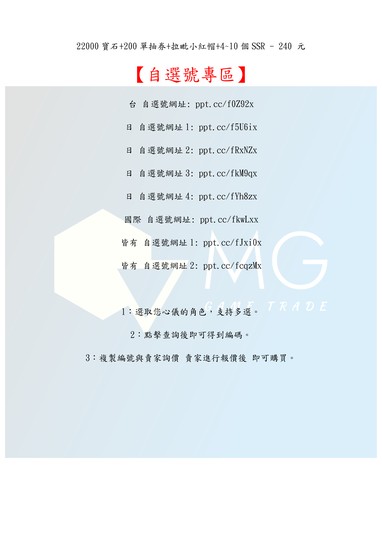 1.此為虚擬商品,不支持七天鑑賞期,介意勿購。 2.移交如有問題請勿更動帳號及綁定,請先聯繫賣家。 3.確認無誤後,請依遊戲綁定方式更改密碼及綁定。 4.下單前請確認商品內容是否變更,未標示資源為隨機。 台 自選號網址: ppt.cc/f0Z92x 日 自選號網址1: ppt.cc/fRxNZx 日 自選號網址2: ppt.cc/fYh8zx 日 自選號網址3: ppt.cc/ffvnpx 日 自選號網址4: ppt.cc/f5U6ix 皆有 自選號網址: ppt.cc/fMcMMx 國際 自選號網址1: ppt.cc/fkwLxx 國際 自選號網址2: ppt.cc/fD1NXx