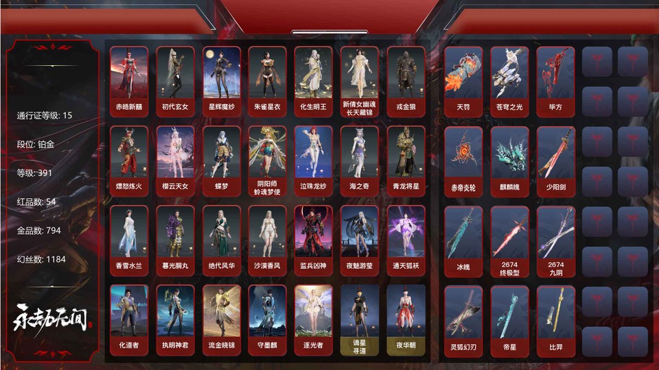紅色神品:赤皓新囍,初代玄女,星輝魔紗,朱雀星衣,化生明王,新倩女幽魂·長天藏錦,戎金狼,熛怒煉火,櫻雲天女,蝶夢,陰陽師·蛉魂夢使,墨離,泣珠龍紗,海之奇,青龍將星,香雪水蘭,暮光胴丸,絕代風華,沙漠香風,監兵凶神,夜魅遊瑩,通天狐襖,化道者,執明神君,流金曉錦,守墨麒,逐光者,天罰,蒼穹之光,畢方,赤帝炎輪,麒麟魄,少陽劍,冰魄,2674·終極型,2674·九陰,靈狐幻刃,帝星,比羿,龍雀,烈