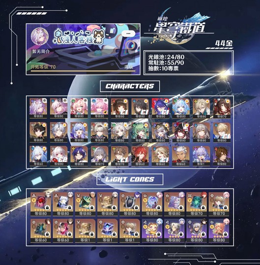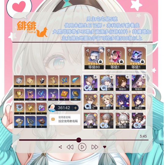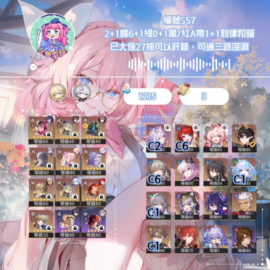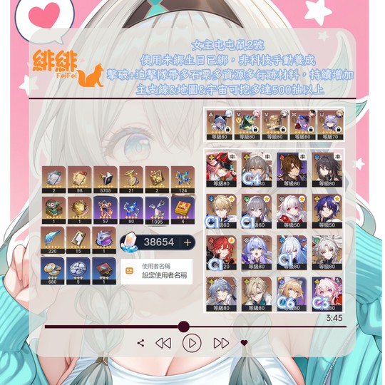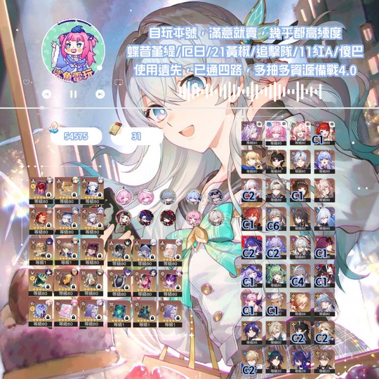 | *圖3 | 全員追擊隊大全+高金,全部限定角色全連專大畢業 | 650多抽以上可屯鳥滿命/XP滿命/強度滿命,昔版本主線等等都還沒動。新補蝶堇 | 15xxx |