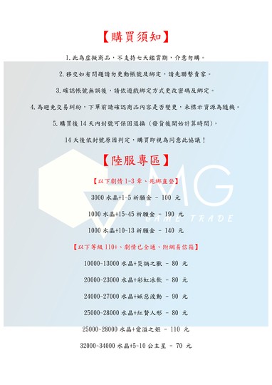 1.此為虚擬商品,不支持七天鑑賞期,介意勿購。 2.移交如有問題請勿更動帳號及綁定,請先聯繫賣家。 3.確認帳號無誤後,請依遊戲綁定方式更改密碼及綁定。 4.為避免交易糾紛,下單前請確認商品內容是否變更,未標示資源為隨機。 5.購買後14天內封號可保固退換 (發貨後開始計算時間), 14天後依封號原因判定,購買即視為同意此協議!
