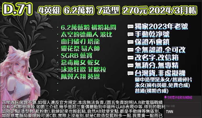 30等.6萬粉.10~13造型.5~10英雄.可挑造型.此賣場有圖可看 |