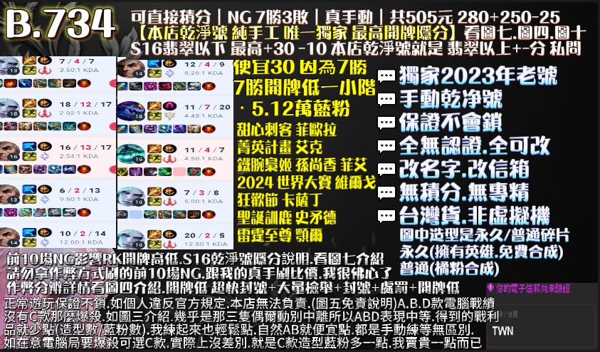 🔹獨家RK最高開牌隱分:手工代刷前10場NG 好KDA+保8勝+6H =拉高開牌
