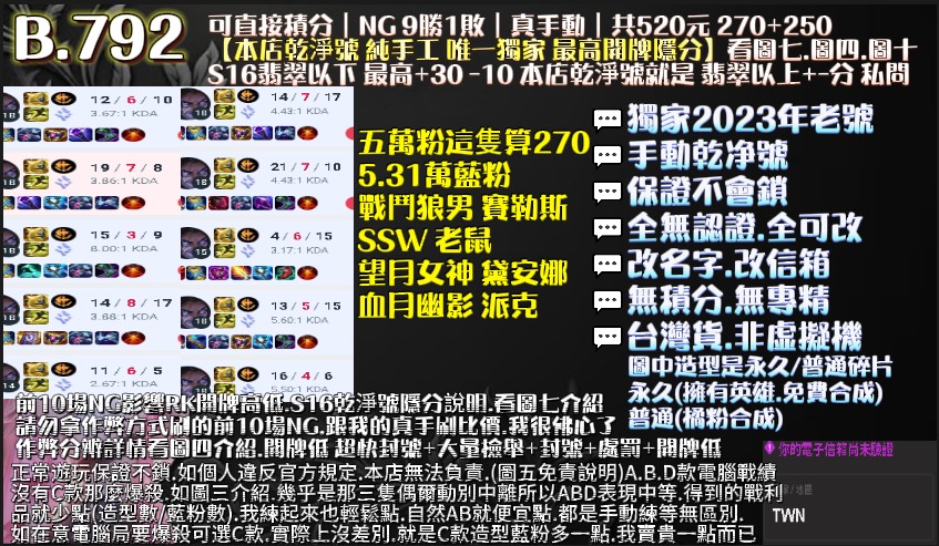 ⛔購買可直接積分商品,一定要求店家給你查詢前10場NG的戰績,直接對比本店10場戰績 就知道是不是真手刷 不會分辨就問我